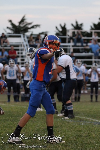 Otis-Bison Cougar Colin Regan (#10) checks to see if he is on the line during the Pratt-Skyline at Otis-Bison High School Football game with Pratt-Skyline winning 44 to 38 in Overtime at Otis-Bison High School in Otis, Kansas on September 27, 2013. (Photo: Joey Bahr, www.joeybahr.com)