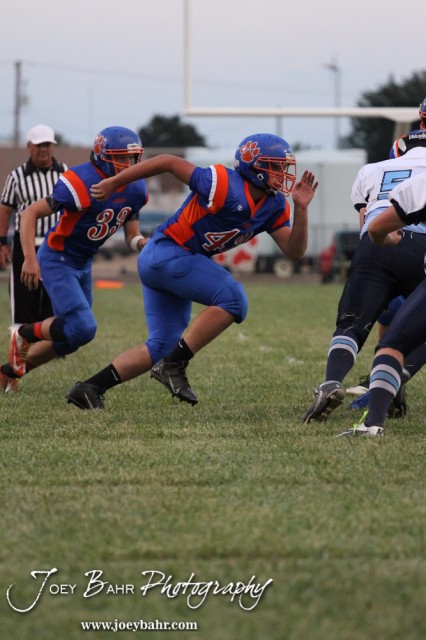 Otis-Bison Cougar Bryce Maneth (#42) runs toward the ball during the Pratt-Skyline at Otis-Bison High School Football game with Pratt-Skyline winning 44 to 38 in Overtime at Otis-Bison High School in Otis, Kansas on September 27, 2013. (Photo: Joey Bahr, www.joeybahr.com)