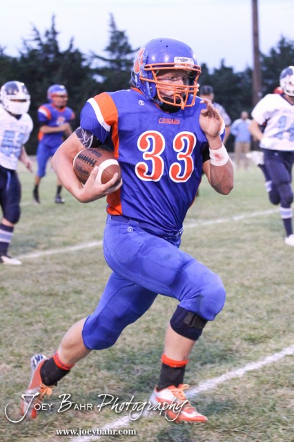 Otis-Bison Cougar Jordan Hoffman (#33) carries the ball during the Pratt-Skyline at Otis-Bison High School Football game with Pratt-Skyline winning 44 to 38 in Overtime at Otis-Bison High School in Otis, Kansas on September 27, 2013. (Photo: Joey Bahr, www.joeybahr.com)