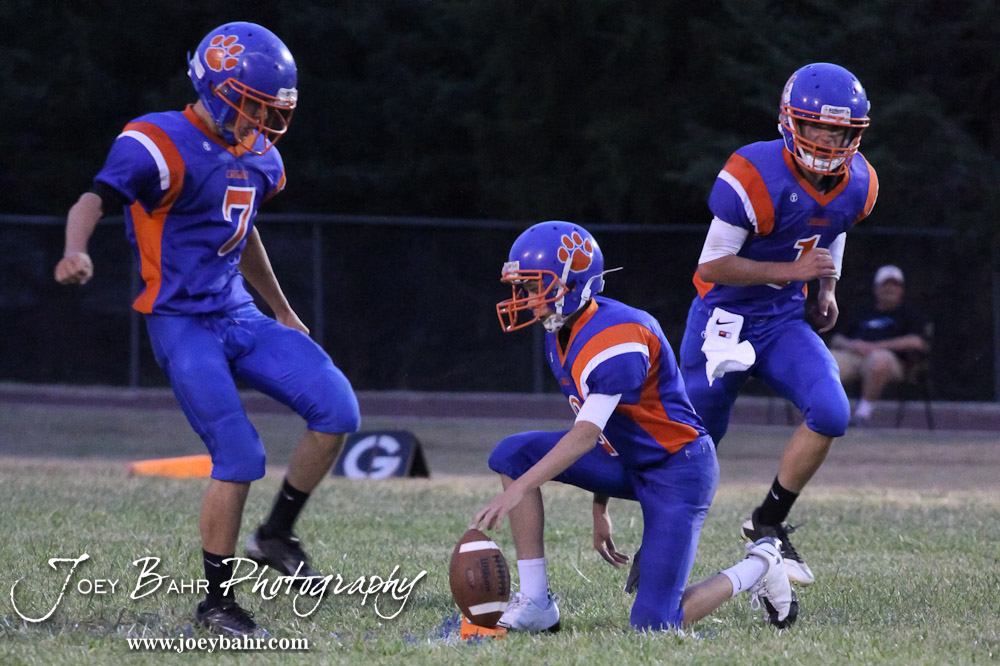 Otis-Bison Cougar Nick Higgason (#7) kicks off the ball during the Pratt-Skyline at Otis-Bison High School Football game with Pratt-Skyline winning 44 to 38 in Overtime at Otis-Bison High School in Otis, Kansas on September 27, 2013. (Photo: Joey Bahr, www.joeybahr.com)