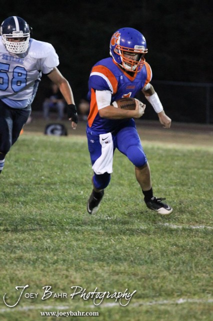 Otis-Bison Cougar Kole Urban (#1) runs with the ball as Skyline Thunderbird Layton Kenworthy (#58) pursues during the Pratt-Skyline at Otis-Bison High School Football game with Pratt-Skyline winning 44 to 38 in Overtime at Otis-Bison High School in Otis, Kansas on September 27, 2013. (Photo: Joey Bahr, www.joeybahr.com)