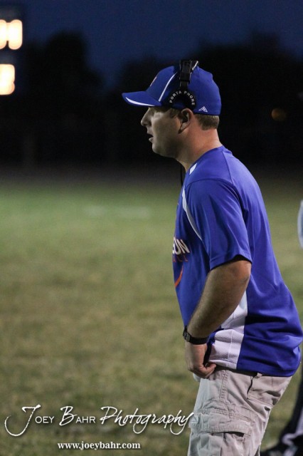 Otis-Bison Cougar Head Coach Travis Starr watches a play unfold during the Pratt-Skyline at Otis-Bison High School Football game with Pratt-Skyline winning 44 to 38 in Overtime at Otis-Bison High School in Otis, Kansas on September 27, 2013. (Photo: Joey Bahr, www.joeybahr.com)