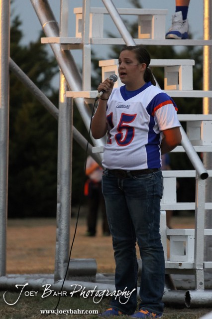 Otis-Bison High School student Megan Tammen sings the National Anthem before the Pratt-Skyline at Otis-Bison High School Football game with Pratt-Skyline winning 44 to 38 in Overtime at Otis-Bison High School in Otis, Kansas on September 27, 2013. (Photo: Joey Bahr, www.joeybahr.com)