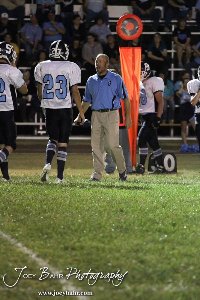 Skyline Thunderbird Head Coach Jon Novotny talks to his players during the Pratt-Skyline at Otis-Bison High School Football game with Pratt-Skyline winning 44 to 38 in Overtime at Otis-Bison High School in Otis, Kansas on September 27, 2013. (Photo: Joey Bahr, www.joeybahr.com)