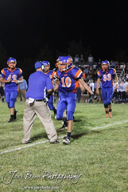 Otis-Bison Cougar Colin Regan (#10) celebrates a play with Assistant Coach Curtis Little during the Pratt-Skyline at Otis-Bison High School Football game with Pratt-Skyline winning 44 to 38 in Overtime at Otis-Bison High School in Otis, Kansas on September 27, 2013. (Photo: Joey Bahr, www.joeybahr.com)