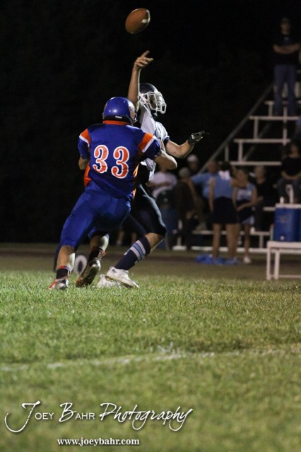 Skyline Thunderbird Cole Patterson (#12) throws a pass while Otis-Bison Cougar Jordan Hoffman (#33) applies pressure during the Pratt-Skyline at Otis-Bison High School Football game with Pratt-Skyline winning 44 to 38 in Overtime at Otis-Bison High School in Otis, Kansas on September 27, 2013. (Photo: Joey Bahr, www.joeybahr.com)