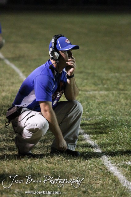 Otis-Bison Cougar Head Coach Travis Starr watches his players during the Pratt-Skyline at Otis-Bison High School Football game with Pratt-Skyline winning 44 to 38 in Overtime at Otis-Bison High School in Otis, Kansas on September 27, 2013. (Photo: Joey Bahr, www.joeybahr.com)