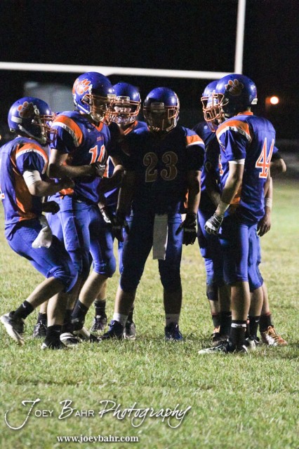 The Otis-Bison Cougars huddle up during the Pratt-Skyline at Otis-Bison High School Football game with Pratt-Skyline winning 44 to 38 in Overtime at Otis-Bison High School in Otis, Kansas on September 27, 2013. (Photo: Joey Bahr, www.joeybahr.com)