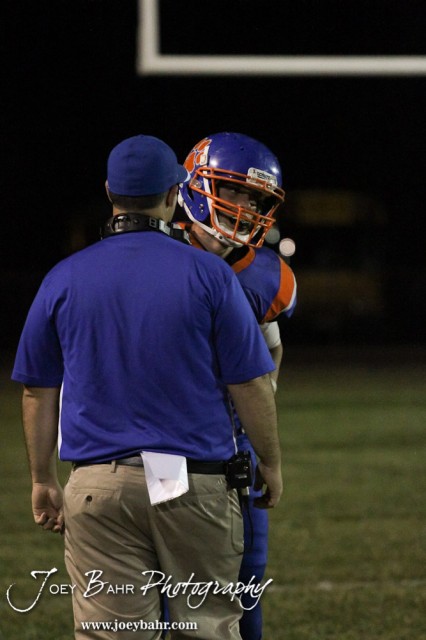 Otis-Bison Cougar Kole Urban (#1) tries to catch his breath after a 75 yard touchdown run during the Pratt-Skyline at Otis-Bison High School Football game with Pratt-Skyline winning 44 to 38 in Overtime at Otis-Bison High School in Otis, Kansas on September 27, 2013. (Photo: Joey Bahr, www.joeybahr.com)