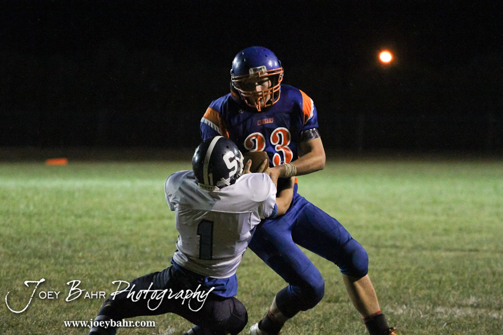 Otis-Bison Cougar Jordan Hoffman (#33) runs into Skyline Thunderbird Colin Little (#1) during the Pratt-Skyline at Otis-Bison High School Football game with Pratt-Skyline winning 44 to 38 in Overtime at Otis-Bison High School in Otis, Kansas on September 27, 2013. (Photo: Joey Bahr, www.joeybahr.com)