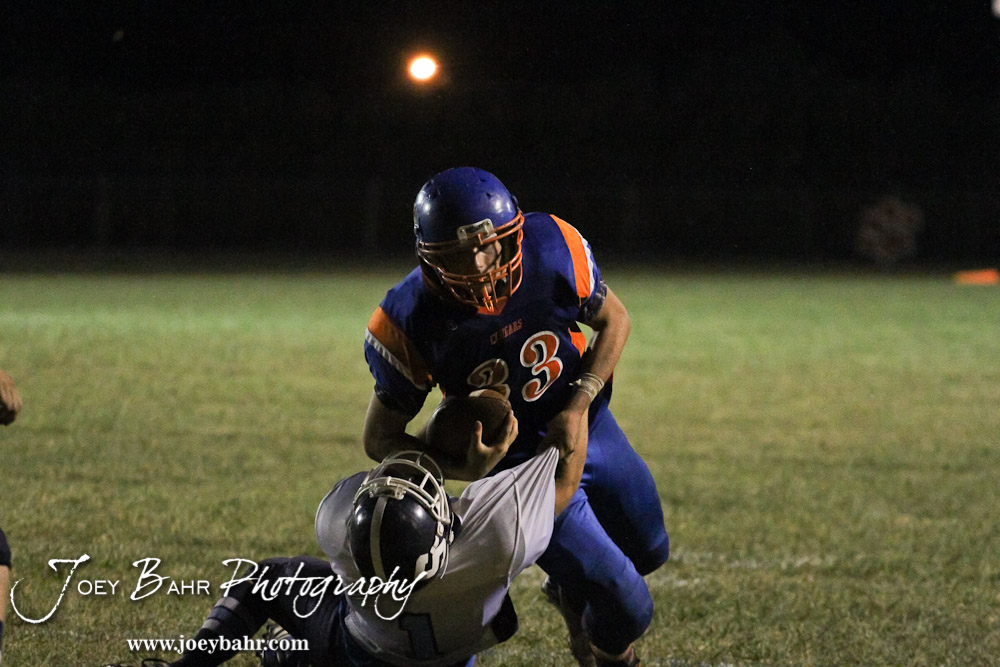 Otis-Bison Cougar Jordan Hoffman (#33) runs over Skyline Thunderbird Colin Little (#1) during the Pratt-Skyline at Otis-Bison High School Football game with Pratt-Skyline winning 44 to 38 in Overtime at Otis-Bison High School in Otis, Kansas on September 27, 2013. (Photo: Joey Bahr, www.joeybahr.com)
