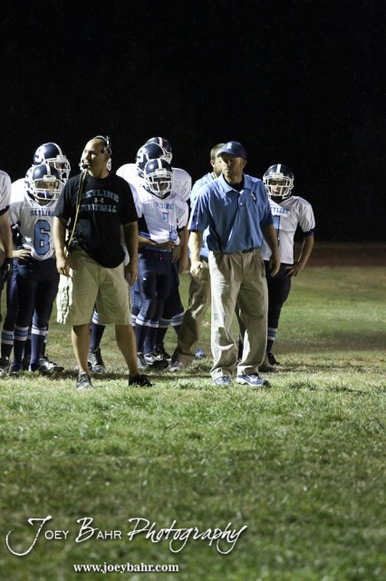 The Skyline Thunderbird coaches watch a play unfold during the Pratt-Skyline at Otis-Bison High School Football game with Pratt-Skyline winning 44 to 38 in Overtime at Otis-Bison High School in Otis, Kansas on September 27, 2013. (Photo: Joey Bahr, www.joeybahr.com)