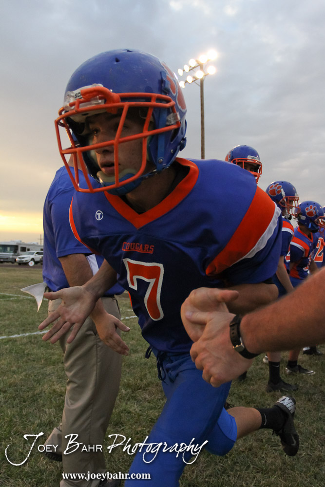Otis-Bison Cougar Nick Higgason (#7) runs out for a player introduction before the Pratt-Skyline at Otis-Bison High School Football game with Pratt-Skyline winning 44 to 38 in Overtime at Otis-Bison High School in Otis, Kansas on September 27, 2013. (Photo: Joey Bahr, www.joeybahr.com)