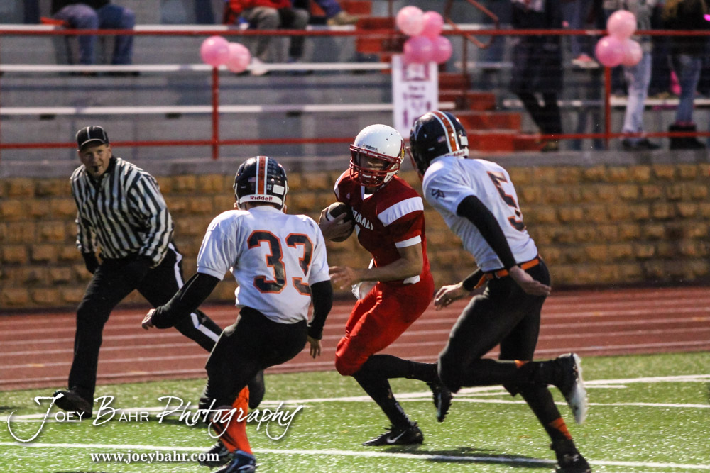 Hoisington Cardinal Tyler Specht (#1) carries the ball as Smoky Valley Viking Brandon Archuleta (#33) and Kyle Anderson (#5) close in during the Hoisington High School versus Smoky Valley football game with Hoisington winning 33 to 12 at Eldon Brown Field in Hoisington, Kansas on October 10, 2014. (Photo: Joey Bahr, www.joeybahr.com)