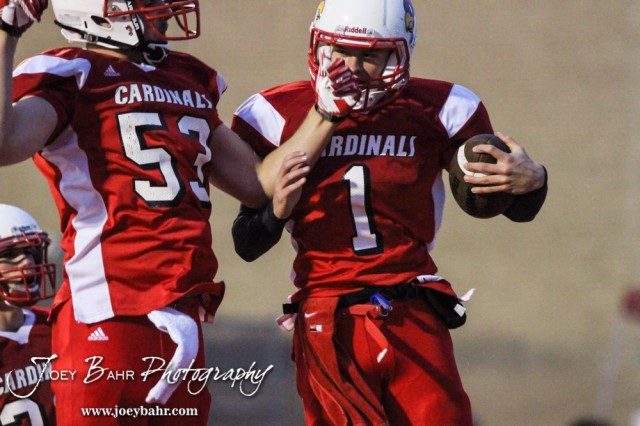 Hoisington Cardinals Chris Wright (#53) and Tyler Specht (#1) celebrate scoring a touchdown during the Hoisington High School versus Smoky Valley football game with Hoisington winning 33 to 12 at Eldon Brown Field in Hoisington, Kansas on October 10, 2014. (Photo: Joey Bahr, www.joeybahr.com)