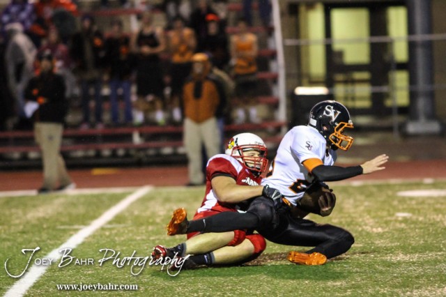 Hoisington Cardinal Landen Urban (#51) pulls down Smoky Valley Viking Kaj Sjogren (#25) in the backfield during the Hoisington High School versus Smoky Valley football game with Hoisington winning 33 to 12 at Eldon Brown Field in Hoisington, Kansas on October 10, 2014. (Photo: Joey Bahr, www.joeybahr.com)