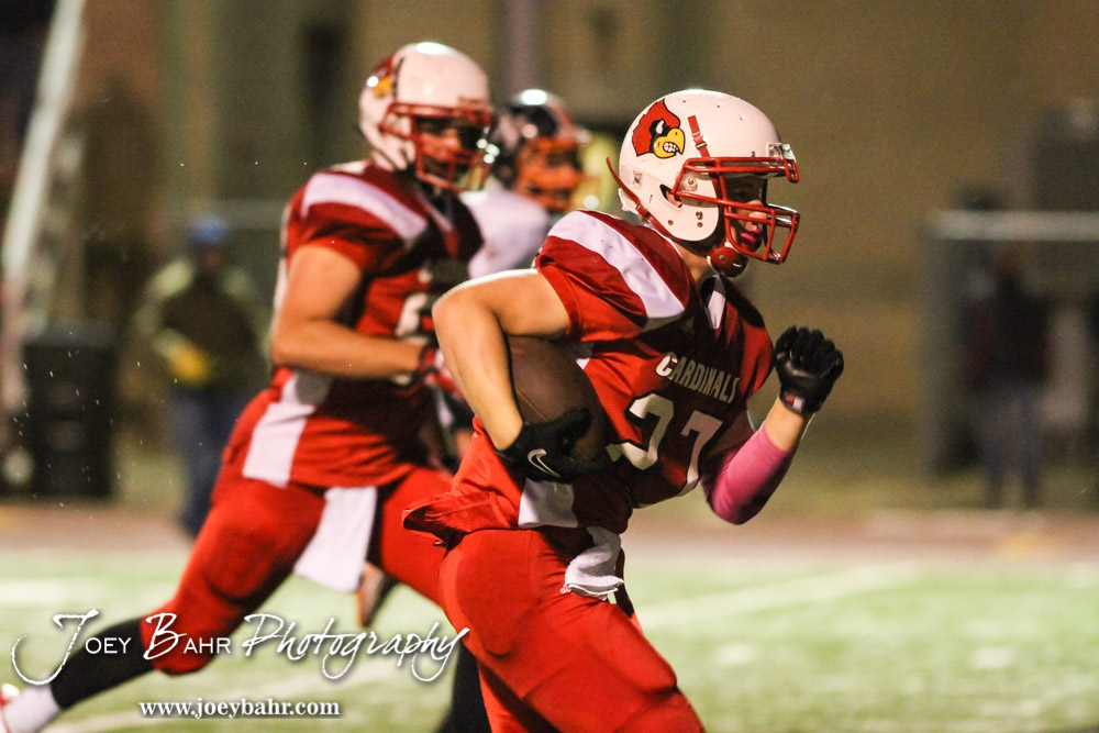 Hoisington Cardinal Hunter Hanzlick (#27) rushes down the field with the ball during the Hoisington High School versus Smoky Valley football game with Hoisington winning 33 to 12 at Eldon Brown Field in Hoisington, Kansas on October 10, 2014. (Photo: Joey Bahr, www.joeybahr.com)