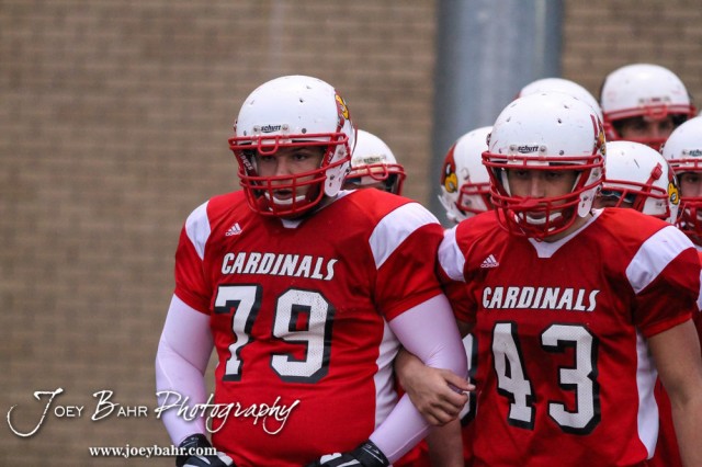 Hoisington Cardinals Seth Owen (#79) and KC Stephens (#43) lead out their teammates prior to the Hoisington High School versus Smoky Valley football game with Hoisington winning 33 to 12 at Eldon Brown Field in Hoisington, Kansas on October 10, 2014. (Photo: Joey Bahr, www.joeybahr.com)