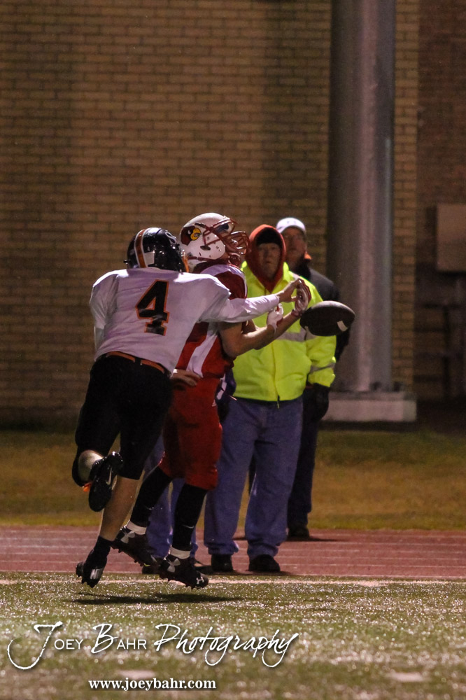 Smoky Valley Viking Cole Norberg (#4) breaks up a pass to Hoisington Cardinal Brandon Ball (#9) during the Hoisington High School versus Smoky Valley football game with Hoisington winning 33 to 12 at Eldon Brown Field in Hoisington, Kansas on October 10, 2014. (Photo: Joey Bahr, www.joeybahr.com)