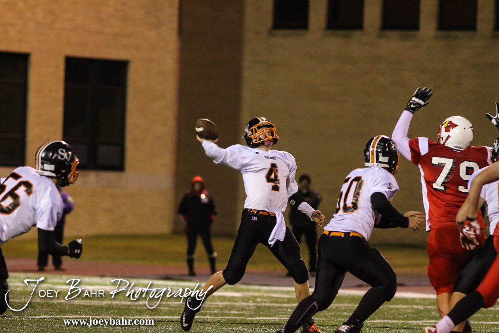 Smoky Valley Viking Cole Norberg (#4) passes the ball during the Hoisington High School versus Smoky Valley football game with Hoisington winning 33 to 12 at Eldon Brown Field in Hoisington, Kansas on October 10, 2014. (Photo: Joey Bahr, www.joeybahr.com)