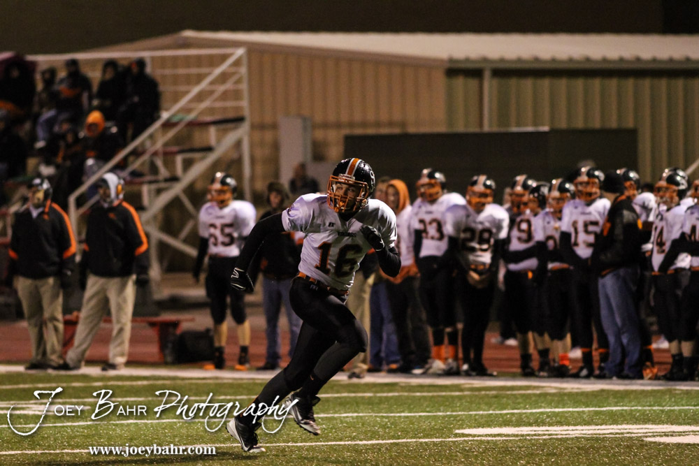 Smoky Valley Viking Trey Schneider (#16) takes off on a route during the Hoisington High School versus Smoky Valley football game with Hoisington winning 33 to 12 at Eldon Brown Field in Hoisington, Kansas on October 10, 2014. (Photo: Joey Bahr, www.joeybahr.com)