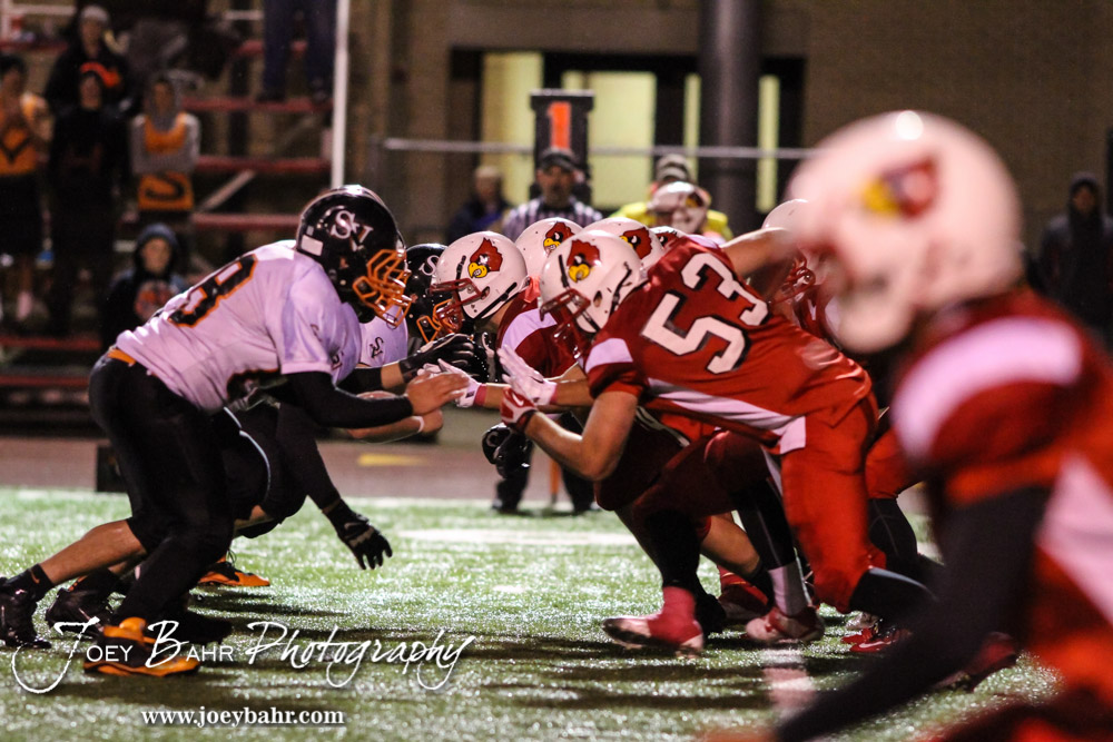 The Hoisington Cardinal Offensive Line launches out of their stances during the Hoisington High School versus Smoky Valley football game with Hoisington winning 33 to 12 at Eldon Brown Field in Hoisington, Kansas on October 10, 2014. (Photo: Joey Bahr, www.joeybahr.com)