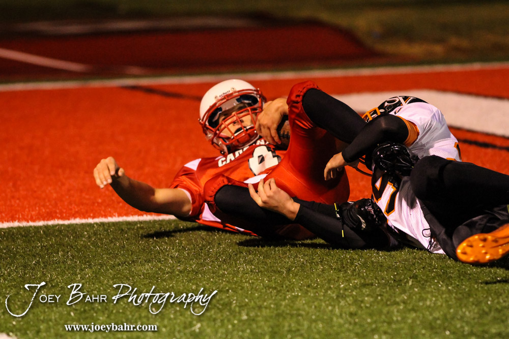 Hoisington Cardinal Steffan Dolechek (#4) slides in near the end zone after catching a pass during the Hoisington High School versus Smoky Valley football game with Hoisington winning 33 to 12 at Eldon Brown Field in Hoisington, Kansas on October 10, 2014. (Photo: Joey Bahr, www.joeybahr.com)
