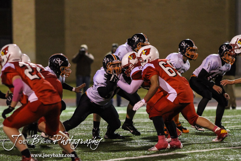 Smoky Valley Viking Caden Byers (#50) blocks a Hoisington Cardinal during the Hoisington High School versus Smoky Valley football game with Hoisington winning 33 to 12 at Eldon Brown Field in Hoisington, Kansas on October 10, 2014. (Photo: Joey Bahr, www.joeybahr.com)