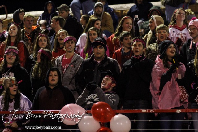 A Hoisington Cardinal fan cheers on the team during the Hoisington High School versus Smoky Valley football game with Hoisington winning 33 to 12 at Eldon Brown Field in Hoisington, Kansas on October 10, 2014. (Photo: Joey Bahr, www.joeybahr.com)