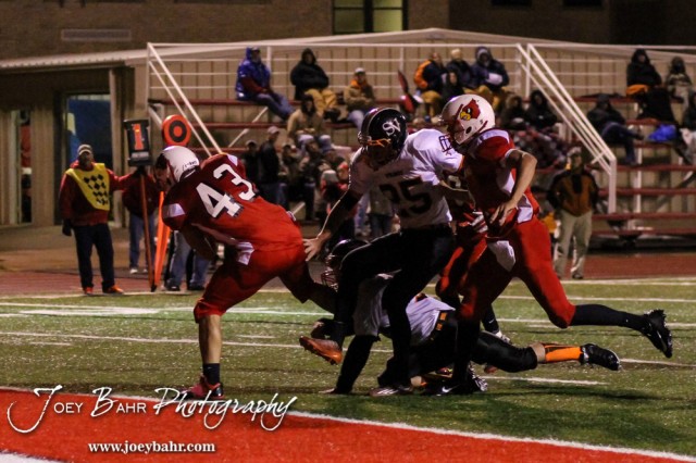 Hoisington Cardinal KC Stephens (#43) scores a touchdown during the Hoisington High School versus Smoky Valley football game with Hoisington winning 33 to 12 at Eldon Brown Field in Hoisington, Kansas on October 10, 2014. (Photo: Joey Bahr, www.joeybahr.com)