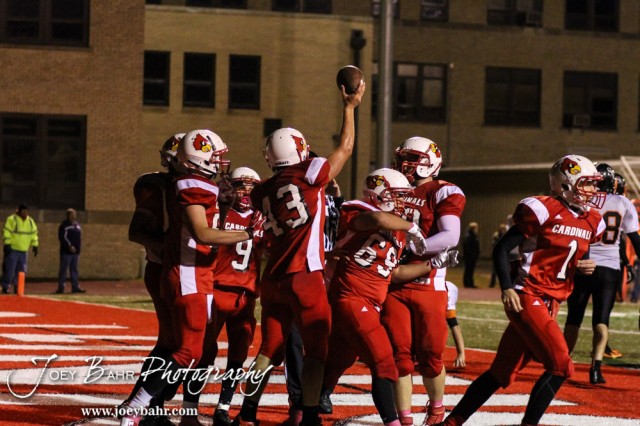 Hoisington Cardinal KC Stephens (#43) celebrates scoring a touchdown during the Hoisington High School versus Smoky Valley football game with Hoisington winning 33 to 12 at Eldon Brown Field in Hoisington, Kansas on October 10, 2014. (Photo: Joey Bahr, www.joeybahr.com)