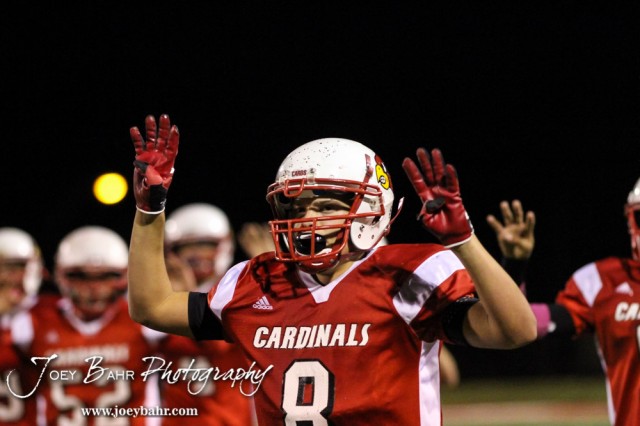 Hoisington Cardinal Grant Dolechek (#8) holds up four fingers to signal the start of the Fourth Quarter during the Hoisington High School versus Smoky Valley football game with Hoisington winning 33 to 12 at Eldon Brown Field in Hoisington, Kansas on October 10, 2014. (Photo: Joey Bahr, www.joeybahr.com)