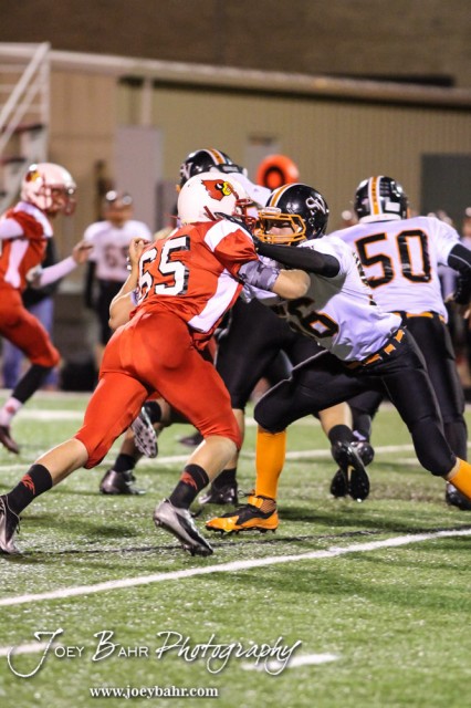 Hoisington Cardinal Ben Schneider (#65) locks up with Smoky Valley Viking Clayton Couchman (#56) during the Hoisington High School versus Smoky Valley football game with Hoisington winning 33 to 12 at Eldon Brown Field in Hoisington, Kansas on October 10, 2014. (Photo: Joey Bahr, www.joeybahr.com)