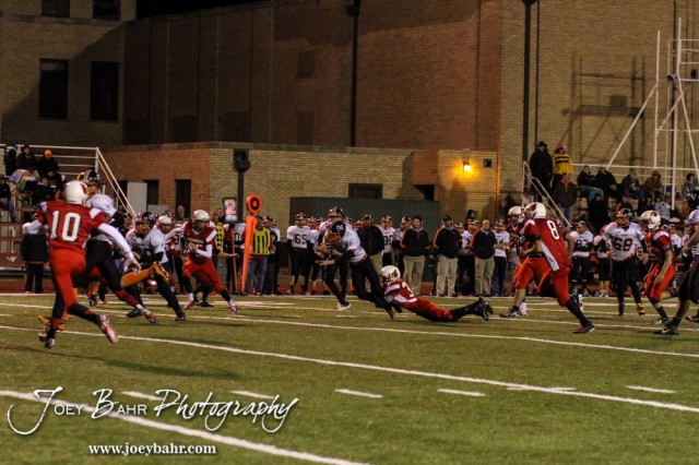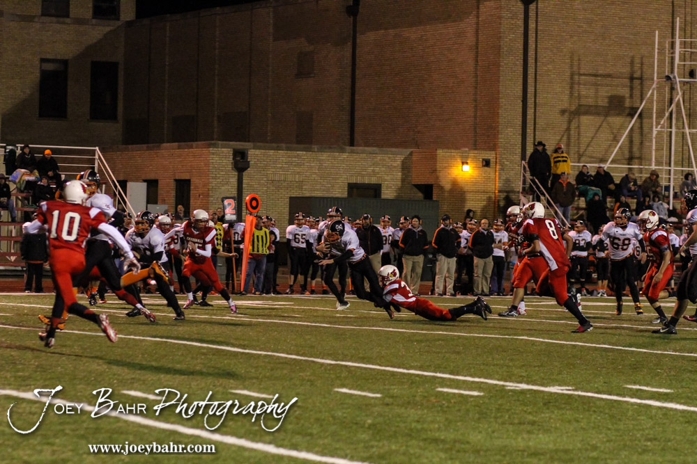 Hoisington Cardinal Jonathan Ball (#30) tries to tackles Smoky Valley Viking Cole Norberg (#4) during the Hoisington High School versus Smoky Valley football game with Hoisington winning 33 to 12 at Eldon Brown Field in Hoisington, Kansas on October 10, 2014. (Photo: Joey Bahr, www.joeybahr.com)