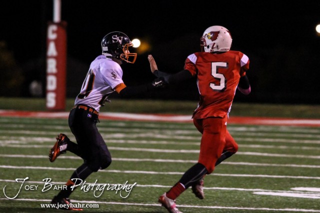 Hoisington Cardinal Cameron Davis (#5) goes to stiff arm Smoky Valley Viking Zach Able (#20) during the Hoisington High School versus Smoky Valley football game with Hoisington winning 33 to 12 at Eldon Brown Field in Hoisington, Kansas on October 10, 2014. (Photo: Joey Bahr, www.joeybahr.com)