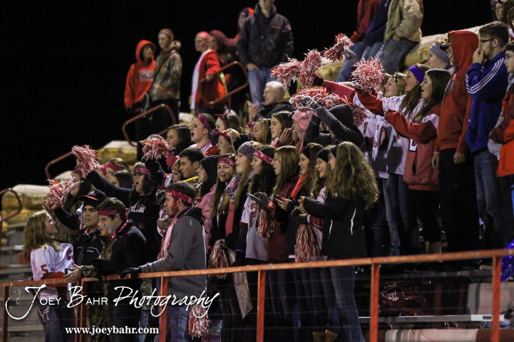 Hoisington Cardinal fans cheer on their team during the Hoisington High School versus Smoky Valley football game with Hoisington winning 33 to 12 at Eldon Brown Field in Hoisington, Kansas on October 10, 2014. (Photo: Joey Bahr, www.joeybahr.com)