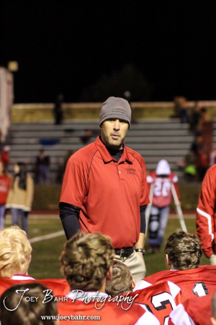 Hoisington Cardinal Head Coach Zach Baird addresses his players after the Hoisington High School versus Smoky Valley football game with Hoisington winning 33 to 12 at Eldon Brown Field in Hoisington, Kansas on October 10, 2014. (Photo: Joey Bahr, www.joeybahr.com)