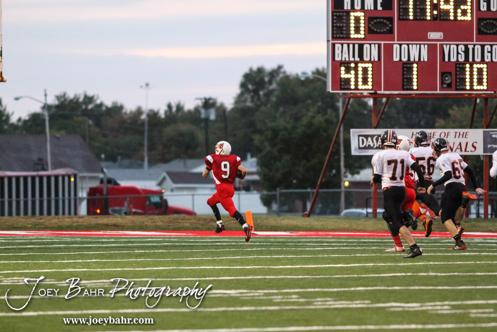 Hoisington Cardinal Brandon Ball (#9) dashes to the end zone during the Hoisington High School versus Smoky Valley football game with Hoisington winning 33 to 12 at Eldon Brown Field in Hoisington, Kansas on October 10, 2014. (Photo: Joey Bahr, www.joeybahr.com)