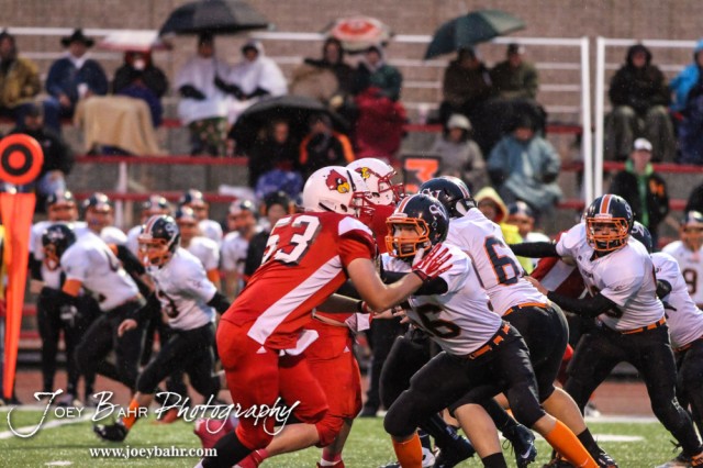 Smoky Valley Viking Clayton Couchman (#56) tries to block Hoisington Cardinal Chris Wright (#53) during the Hoisington High School versus Smoky Valley football game with Hoisington winning 33 to 12 at Eldon Brown Field in Hoisington, Kansas on October 10, 2014. (Photo: Joey Bahr, www.joeybahr.com)
