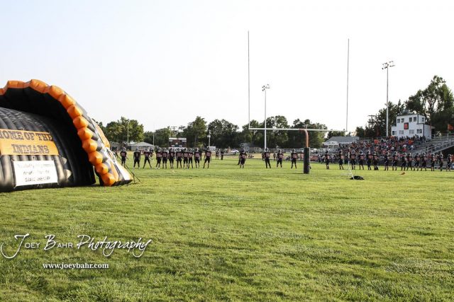 The Larned Indians warmup prior to the start of the game. The Larned Indians defeated the Smoky Valley Vikings by a score of 28 to 14 at Earl Roberts Stadium in Larned, Kansas on September 8, 2017. (Photo: Joey Bahr, www.joeybahr.com)undefined