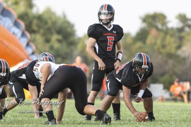 Larned Indian Carson Smith (#5) looks over the Smoky Valley Viking defense in the first quarter. The Larned Indians defeated the Smoky Valley Vikings by a score of 28 to 14 at Earl Roberts Stadium in Larned, Kansas on September 8, 2017. (Photo: Joey Bahr, www.joeybahr.com)undefined