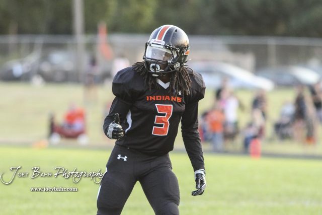 Larned Indian Damontay Phillips (#3) checks with a referee to see if he is on the line or not in the second quarter. The Larned Indians defeated the Smoky Valley Vikings by a score of 28 to 14 at Earl Roberts Stadium in Larned, Kansas on September 8, 2017. (Photo: Joey Bahr, www.joeybahr.com)undefined
