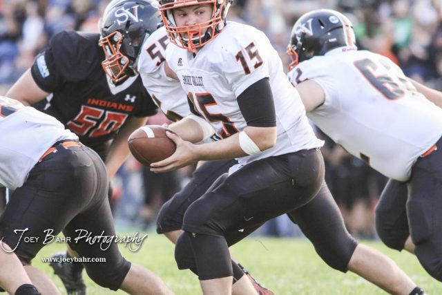 Smoky Valley Viking Brett Heitschmidt (#15) looks back to a back to give the ball to in the second quarter. The Larned Indians defeated the Smoky Valley Vikings by a score of 28 to 14 at Earl Roberts Stadium in Larned, Kansas on September 8, 2017. (Photo: Joey Bahr, www.joeybahr.com)undefined
