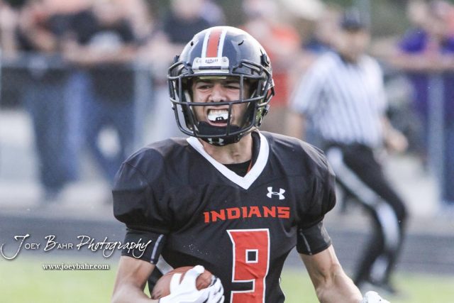 Larned Indian Mason Perez (#9) celebrates receiving a touchdown scoring pass in the second quarter. The Larned Indians defeated the Smoky Valley Vikings by a score of 28 to 14 at Earl Roberts Stadium in Larned, Kansas on September 8, 2017. (Photo: Joey Bahr, www.joeybahr.com)undefined