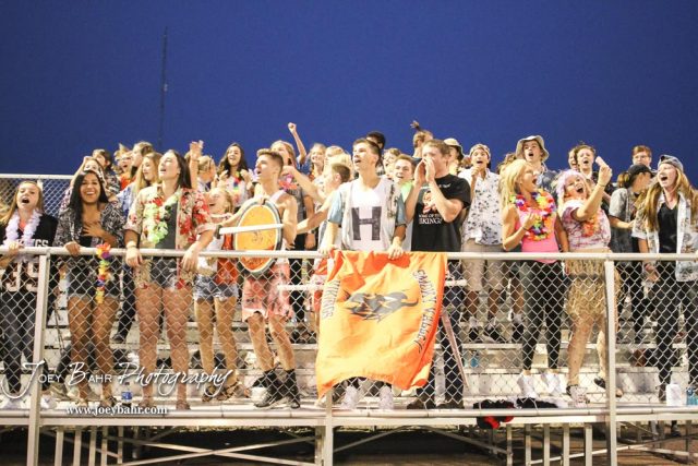 The Smoky Valley Viking student section cheers on their school mates in the third quarter. The Larned Indians defeated the Smoky Valley Vikings by a score of 28 to 14 at Earl Roberts Stadium in Larned, Kansas on September 8, 2017. (Photo: Joey Bahr, www.joeybahr.com)undefined