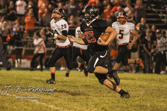 Larned Indian Wes Davis (#23) rushes with the ball in the third quarter. The Larned Indians defeated the Smoky Valley Vikings by a score of 28 to 14 at Earl Roberts Stadium in Larned, Kansas on September 8, 2017. (Photo: Joey Bahr, www.joeybahr.com)undefined