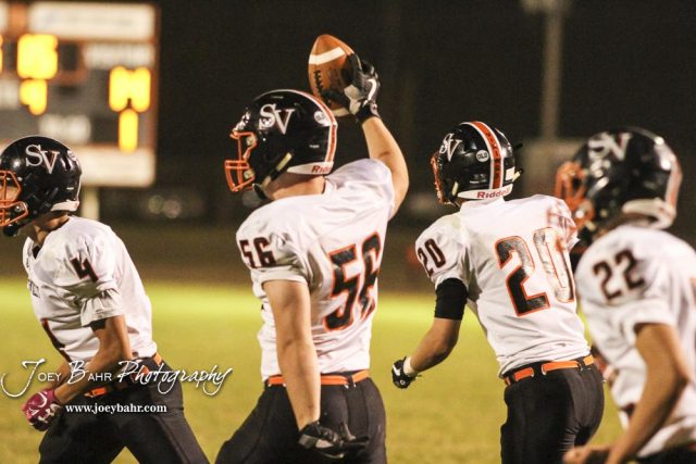 Smoky Valley Viking Carson Holdren (#56) holds up the ball after recovering a fumble on a fourth down play in the fourth quarter. The Larned Indians defeated the Smoky Valley Vikings by a score of 28 to 14 at Earl Roberts Stadium in Larned, Kansas on September 8, 2017. (Photo: Joey Bahr, www.joeybahr.com)undefined