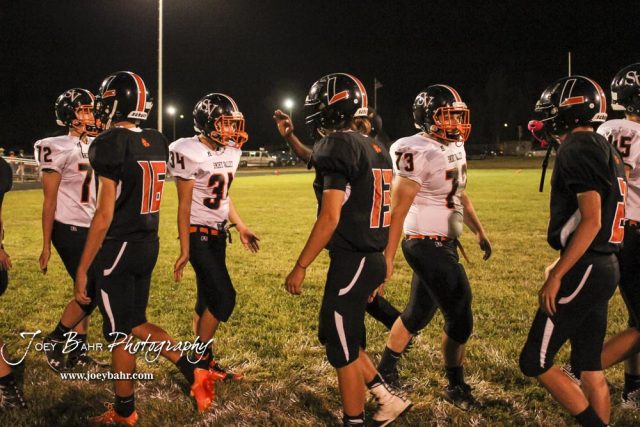 Members of the Smoky Valley Vikings and Larned Indians shake hands following the game. The Larned Indians defeated the Smoky Valley Vikings by a score of 28 to 14 at Earl Roberts Stadium in Larned, Kansas on September 8, 2017. (Photo: Joey Bahr, www.joeybahr.com)undefined