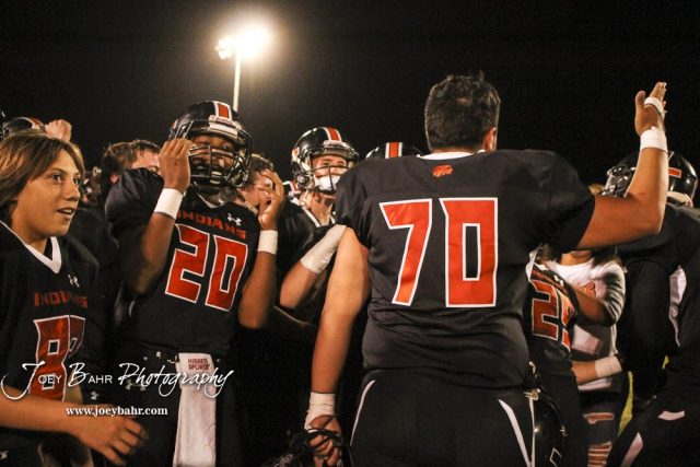 Larned Indian Christian Martinez (#70) pumps up his teammates in a post game huddle. The Larned Indians defeated the Smoky Valley Vikings by a score of 28 to 14 at Earl Roberts Stadium in Larned, Kansas on September 8, 2017. (Photo: Joey Bahr, www.joeybahr.com)undefined