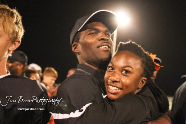 A cheerleader hugs Larned Indian Head Coach A B Stokes following the game. The Larned Indians defeated the Smoky Valley Vikings by a score of 28 to 14 at Earl Roberts Stadium in Larned, Kansas on September 8, 2017. (Photo: Joey Bahr, www.joeybahr.com)undefined